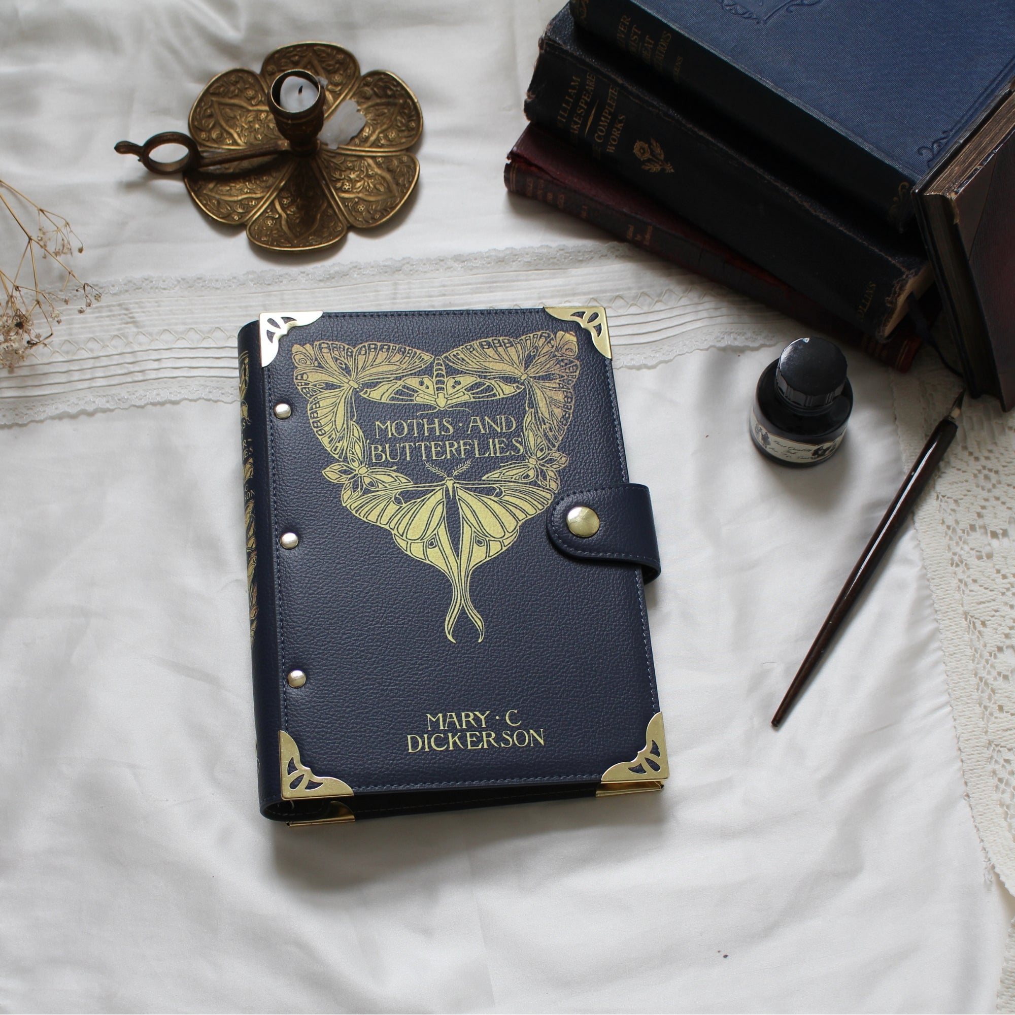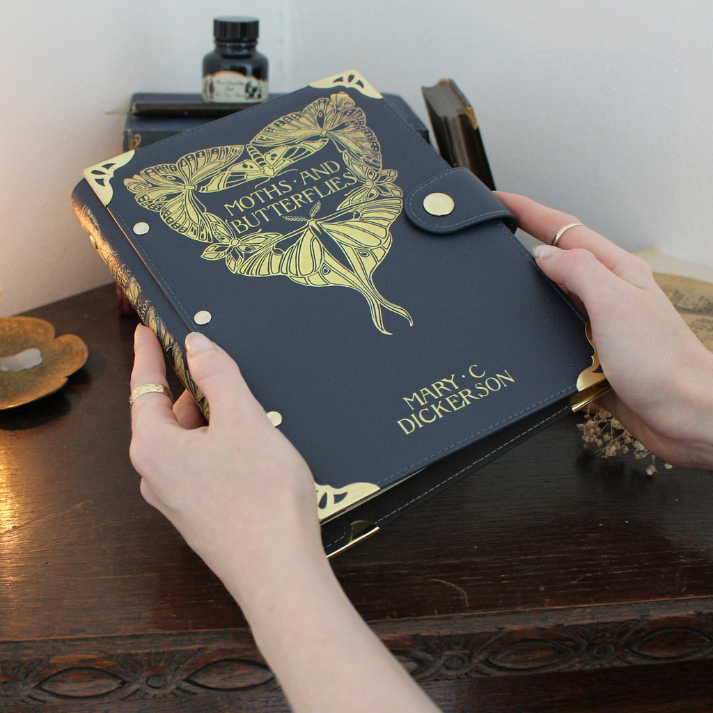 Celebrate the beauty of the natural world with this striking Moths and Butterflies faux-leather ring binder notebook. Inspired by Mary C. Dickerson's book Moths and Butterflies, published in the early 20th century, this notebook features a beautiful gold butterfly design against a navy faux leather backdrop. Dickerson was a prominent naturalist known for her contributions to the study of reptiles and amphibians, and this book is notable for its detailed study of moths and butterflies, blending scientific rigour with accessibility for the general public. The back is adorned with a miniature butterfly motif, adding to its elegant appeal. Add a touch of natural beauty to your daily note-taking!