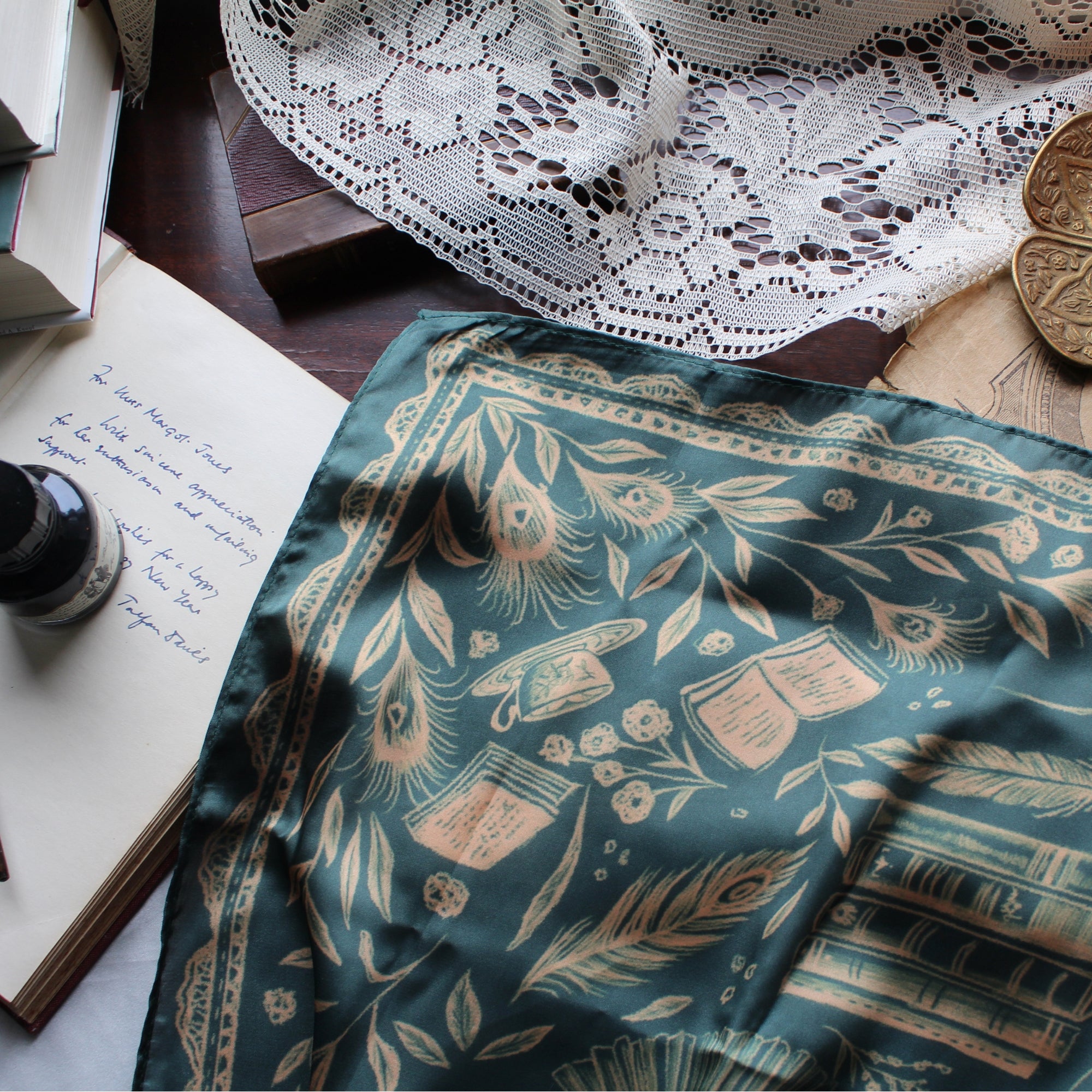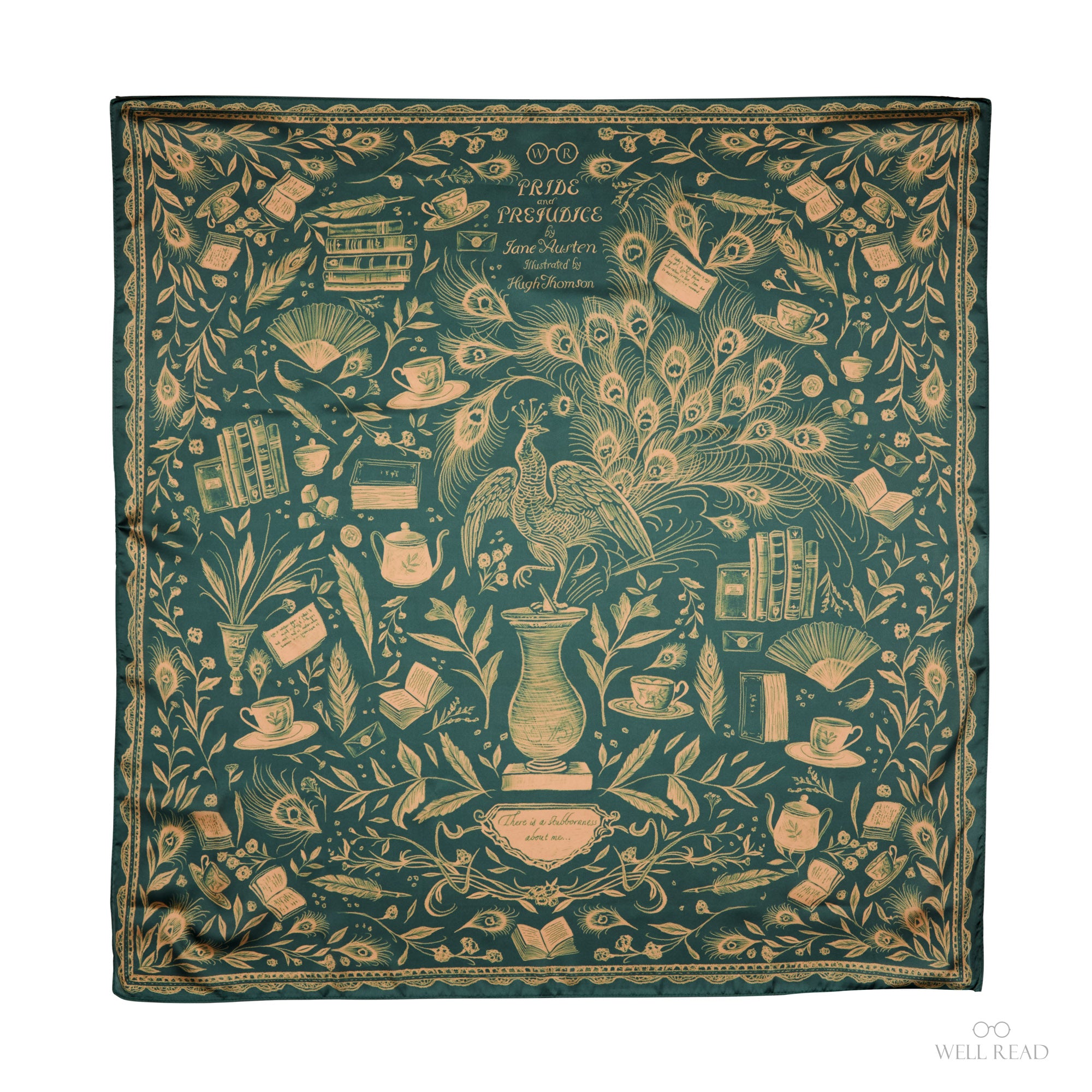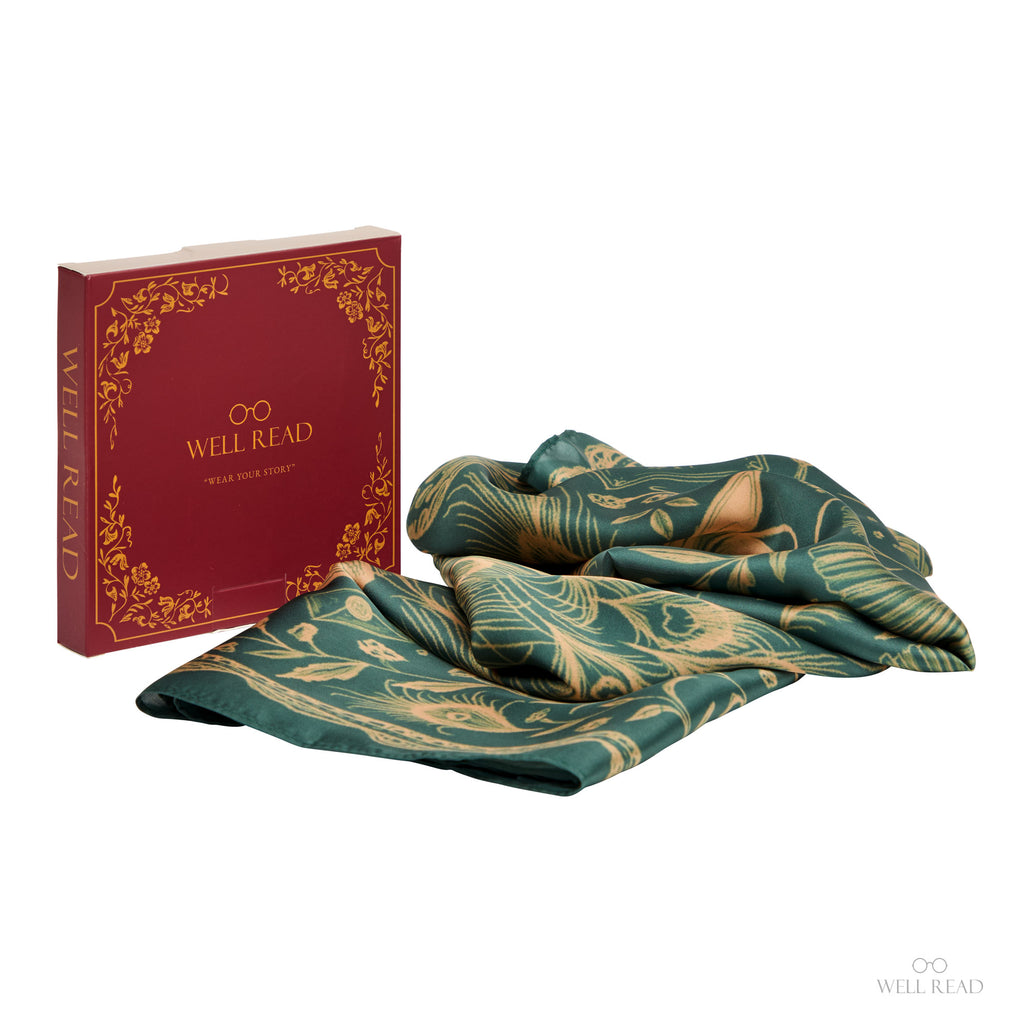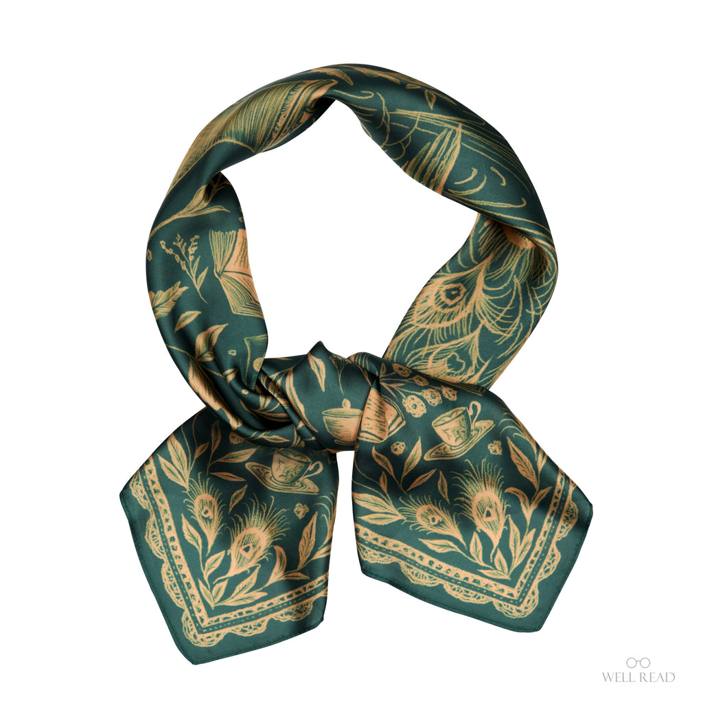 Wrap yourself in Austen. Our Pride and Prejudice scarf features an intricate, hand-drawn illustration inspired by Hugh Thomson’s iconic peacock cover—plumage unfurling among books, letters, teacups, and Regency flourishes, with a subtle nod to Elizabeth Bennet’s spirited wit. The intricate illustrated details pop against a rich green background.