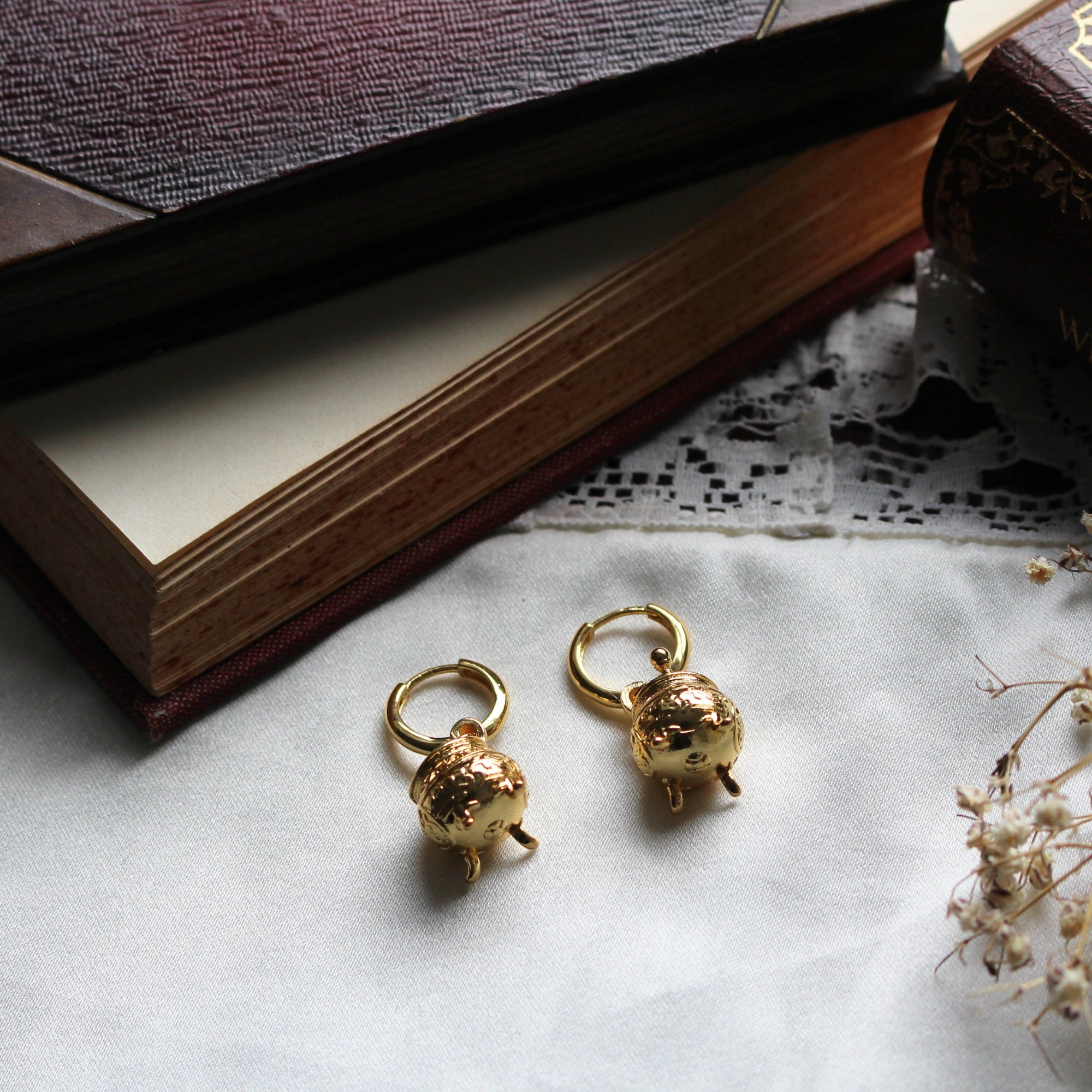 Introducing our The Encyclopedia of Potion Making gold hoop earrings—a bookish homage to wizard apothecaries and the hush of stone-walled classrooms where vials clink and steam curls above ink-stained notes. These miniature cauldron charms nod to classic school-of-magic tales while celebrating the quiet craft of careful brewing.