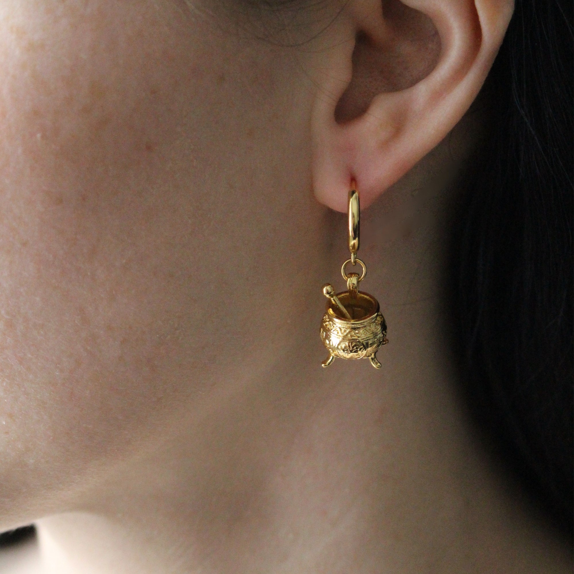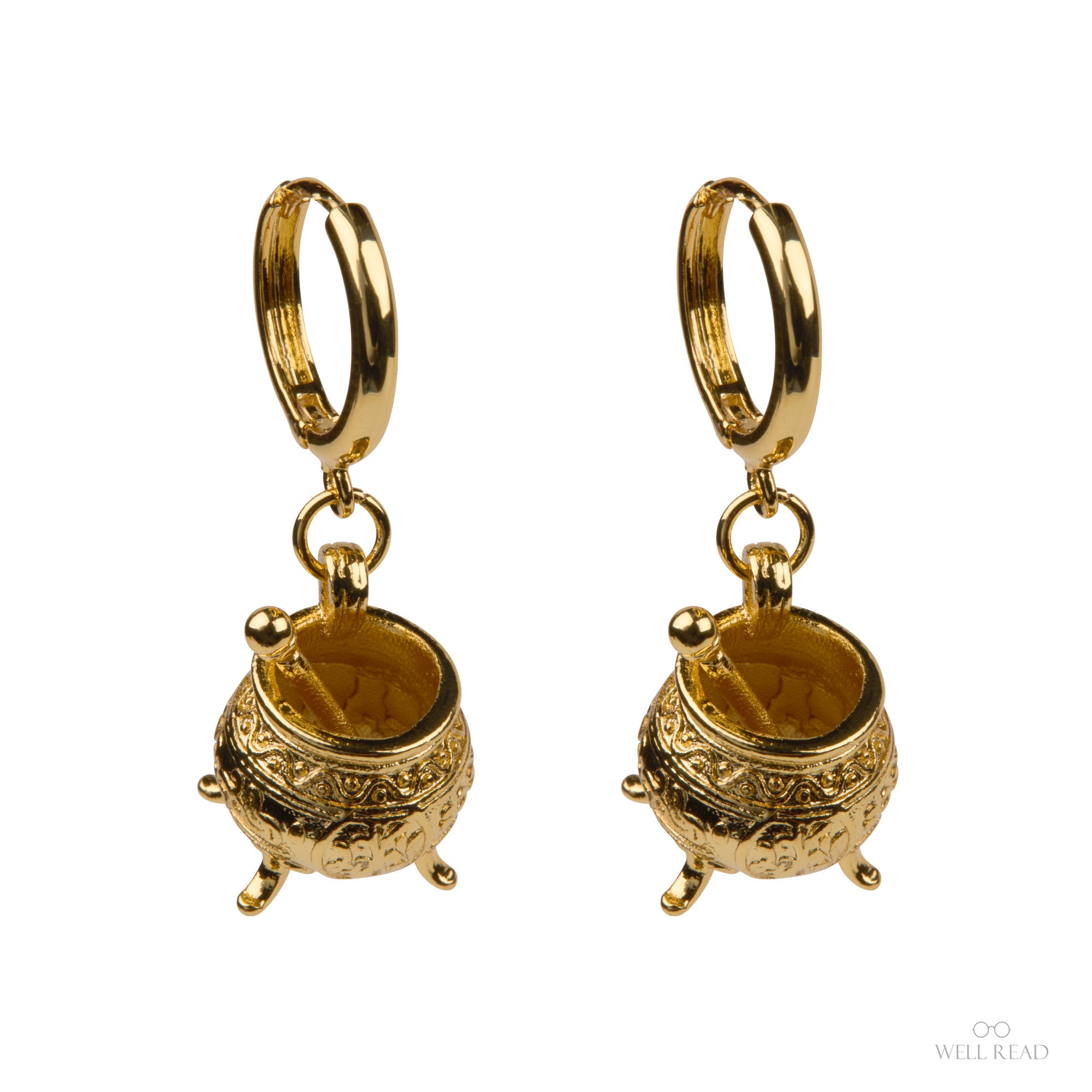 Each earring suspends a miniature golden cauldron charm from a slim hoop—complete with tripod feet and a tiny stirring spoon poised at the rim, as if paused between clockwise and counter-clockwise turns. Rich texture lends the look of well-loved brass from a lamplit, cobbled-lane shop, yet the finish keeps a refined gleam. Lightweight and easy to wear, they style beautifully with crisp collars and cardigans, and pair perfectly with our The Encyclopedia of Potion Making book crossbody bag.