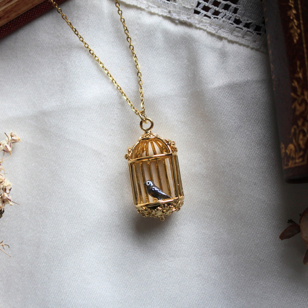 Introducing our Jane Eyre–inspired gold birdcage pendant necklace, a romantic homage to Charlotte Brontë's classic. This delicate piece features a finely wrought golden cage cradling a tiny blue enamel painted bird—an elegant nod to Jane's famous declaration, "I am no bird; and no net ensnares me."