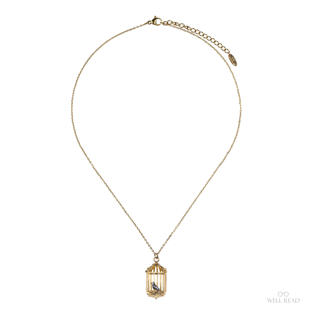 The pendant's filigreed bars and domed top evoke Victorian ornament, while the little bird suggests resilience, self-possession, and the pull between confinement and freedom at Thornfield. Suspended from a lightweight, adjustable gold chain, it layers beautifully and sits comfortably for all-day wear—equally at home with a high-collared blouse or a cozy sweater.