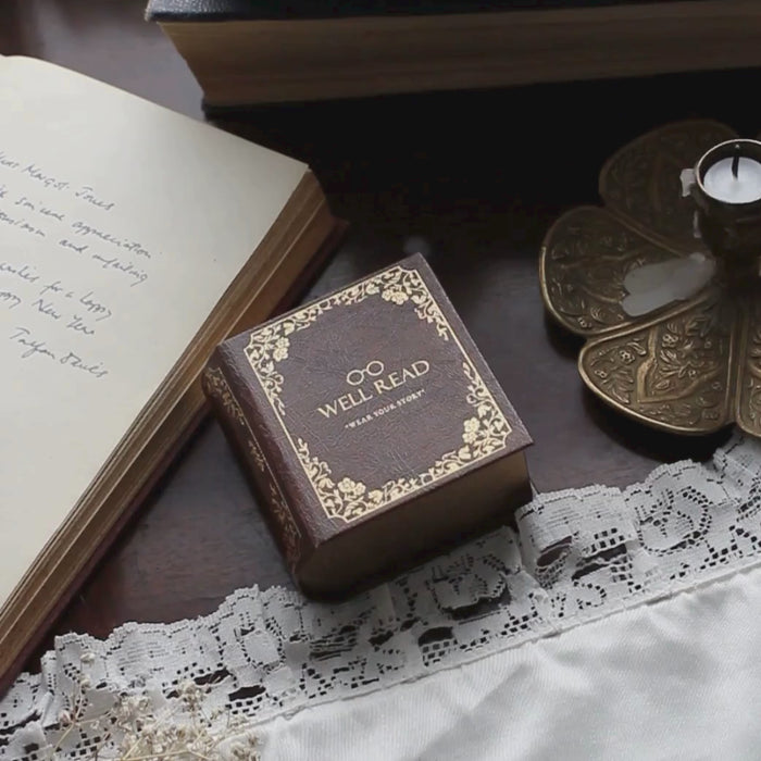 This charming, book-shaped jewelry box is the perfect home for your bookish necklaces. Its vintage-inspired design protects your jewelry and serves as a decorative piece. The luxurious velvet interior keeps your necklace tangle-free, whilst the exterior resembles a classic novel with intricate gold detailing. An ideal gift for book lovers and jewelry enthusiasts alike.