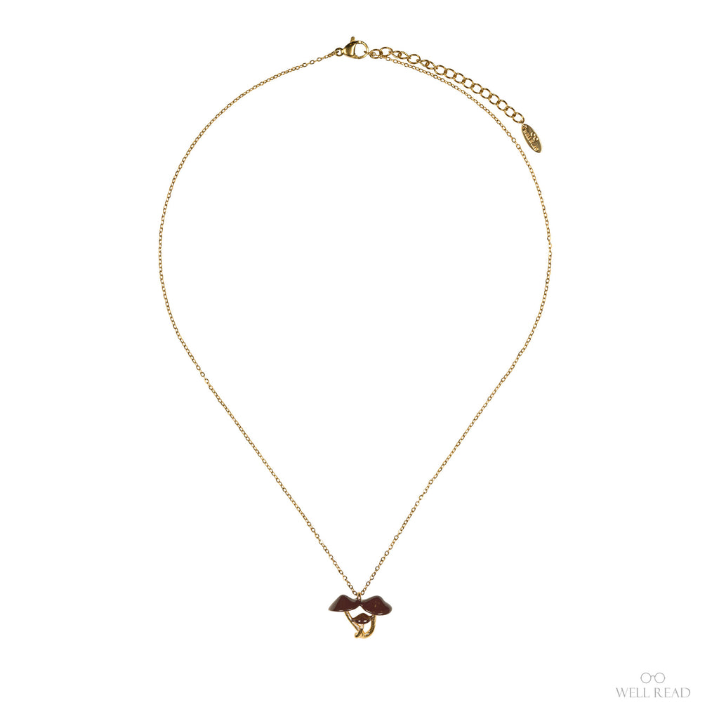Secrets of the Forest Floor Mushroom Gold Bookish Pendant Necklace