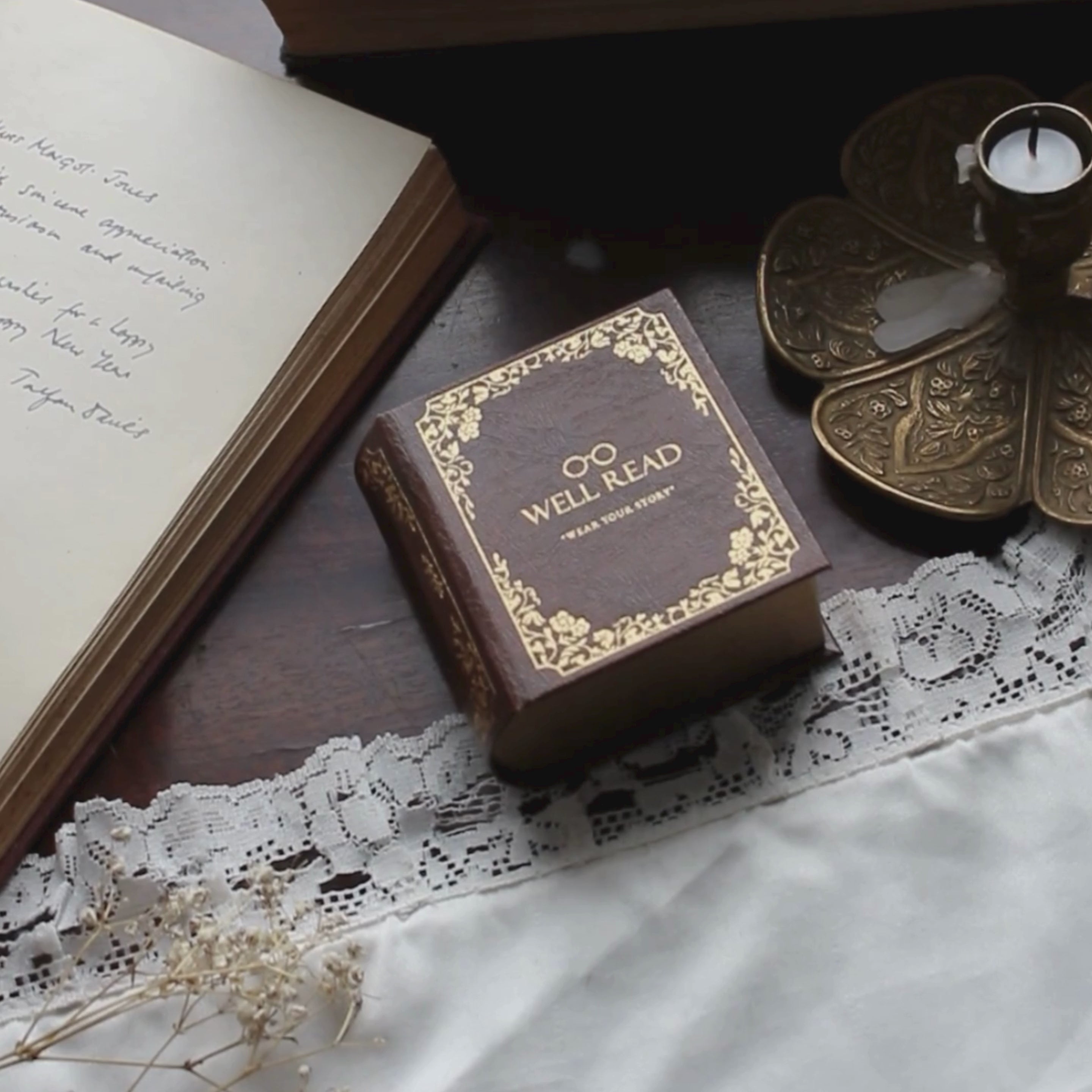 This charming, book-shaped jewelry box is the perfect home for your bookish necklaces. Its vintage-inspired design protects your jewelry and serves as a decorative piece. The luxurious velvet interior keeps your necklace tangle-free, whilst the exterior resembles a classic novel with intricate gold detailing. An ideal gift for book lovers and jewelry enthusiasts alike.