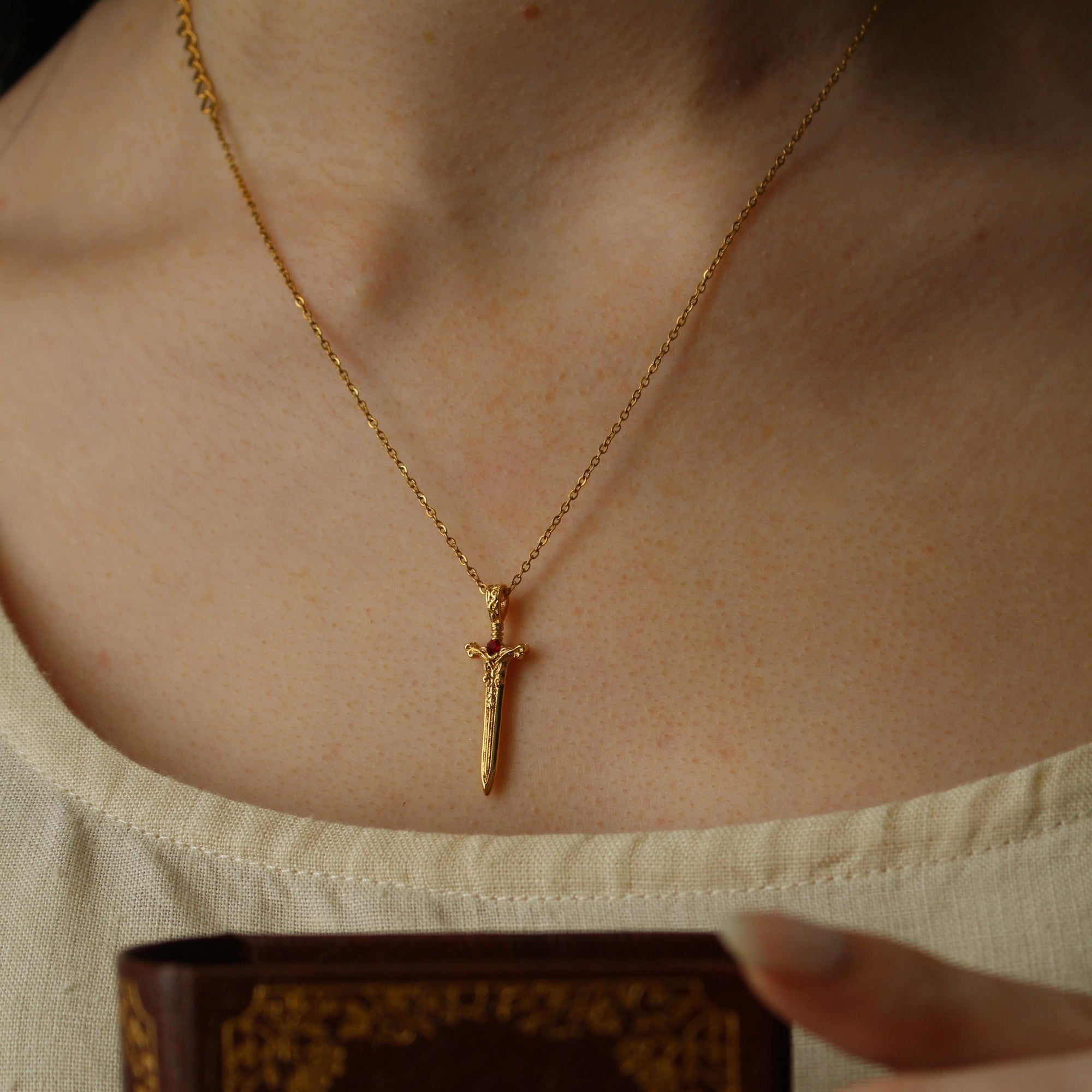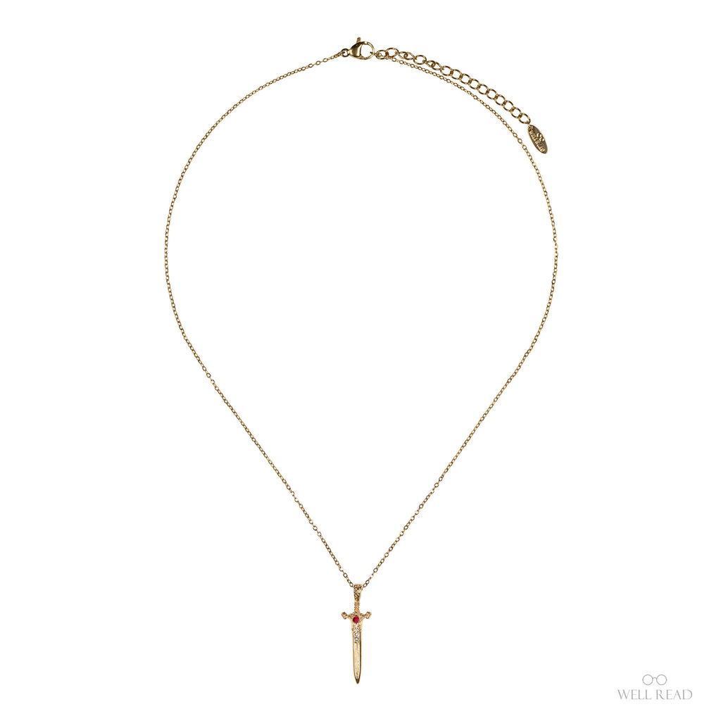 The pendant features a finely cast gold plated sword: a slim blade etched with storybook filigree, a scrolling crossguard, and a crimson stone set in the center. Suspended from a delicate, adjustable chain, it balances mythic drama with everyday elegance—an ideal companion to our The Dragon Sword Chronicles book crossbody bag.