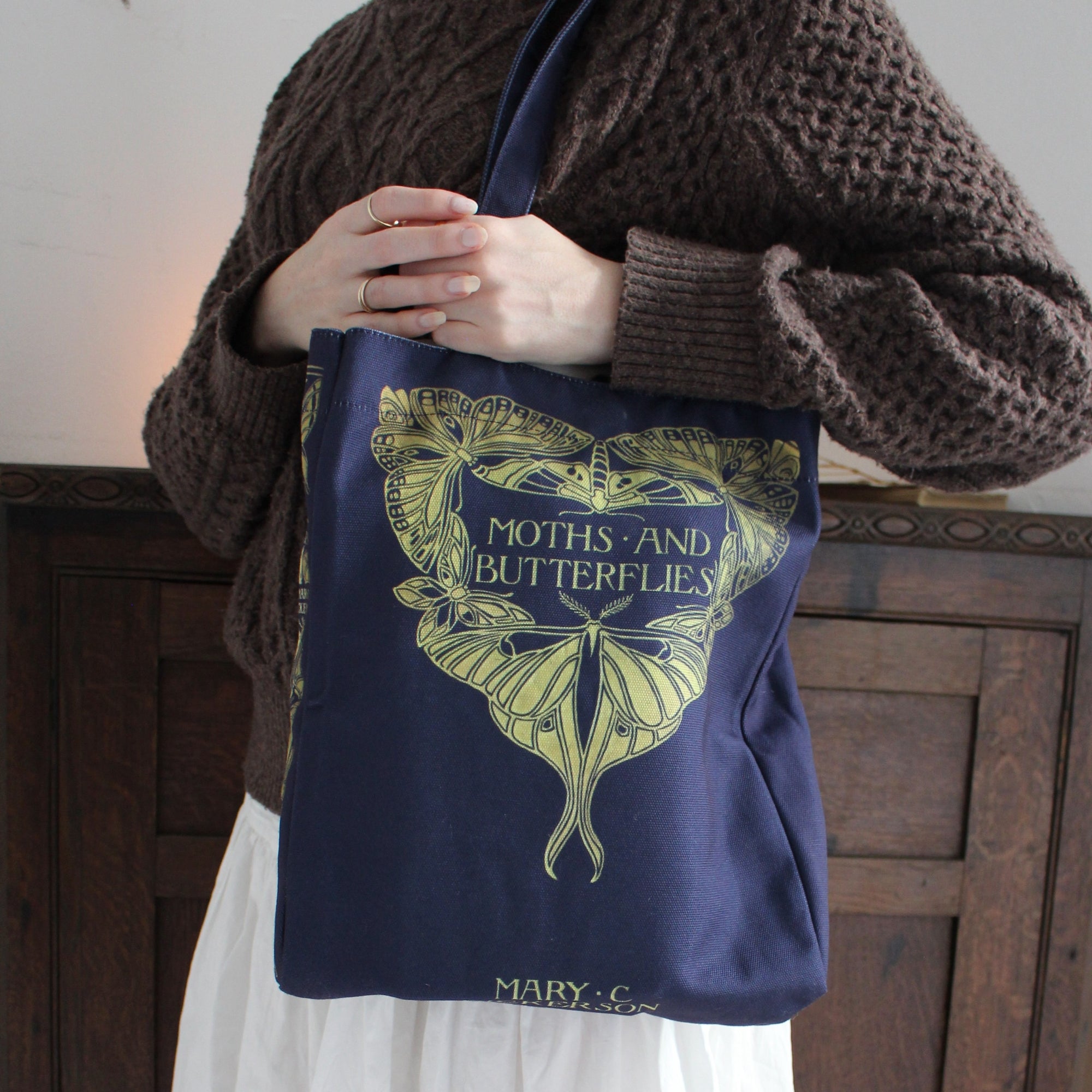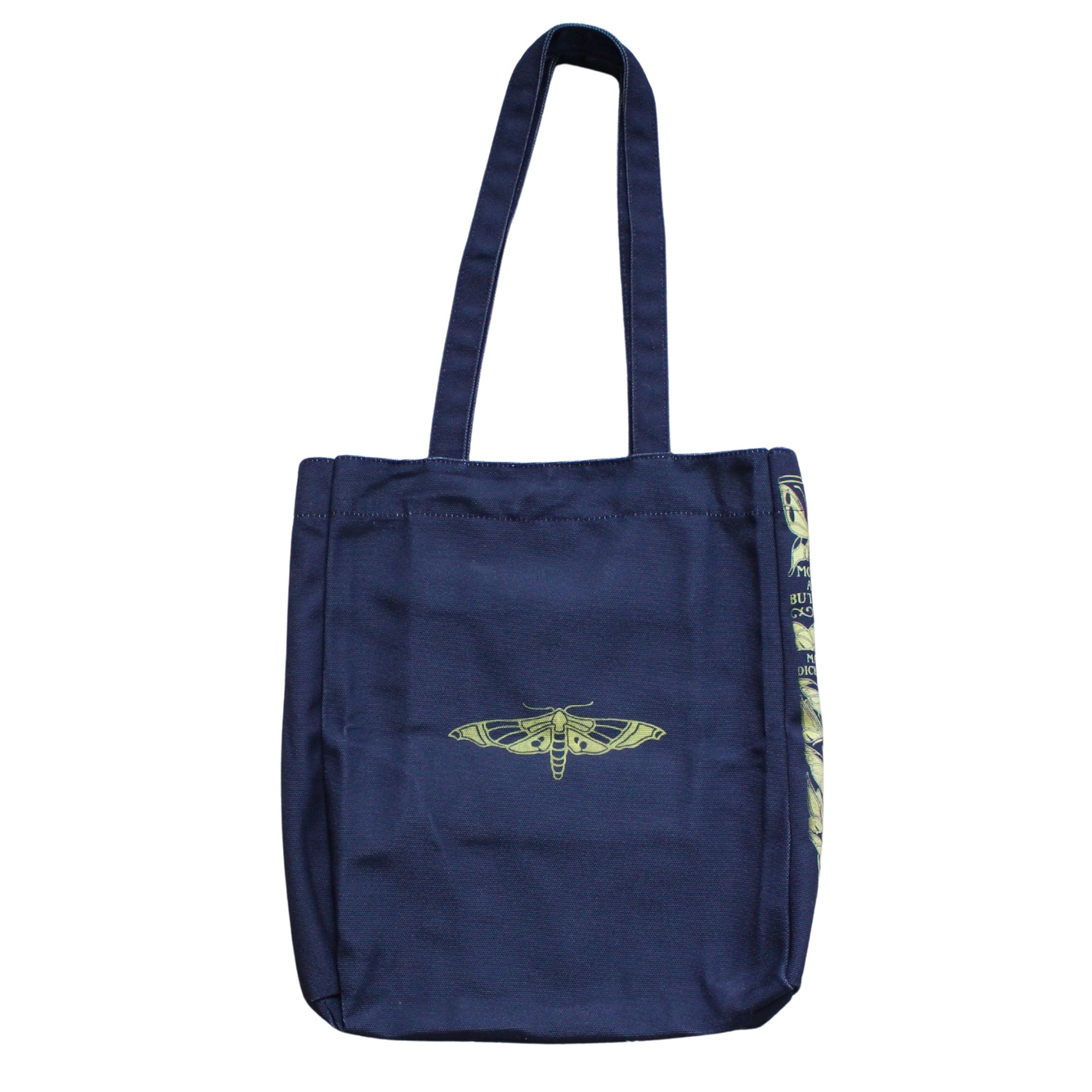 Celebrate the beauty of the natural world with this striking Moths and Butterflies tote bag. Inspired by Mary C. Dickerson's book Moths and Butterflies, published in the early 20th century, this tote features a beautiful gold butterfly design against a navy backdrop. Dickerson was a prominent naturalist known for her contributions to the study of reptiles and amphibians, and this book is notable for its detailed study of moths and butterflies, blending scientific rigour with accessibility for the general public. Made with 100% polyester, the design is durable and perfect for carrying all your daily necessities, from groceries to textbooks. The back is adorned with a miniature butterfly motif, adding to its elegant appeal.